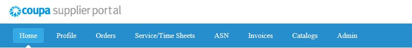 - Navigation Bar: Menu button to navigate to Home, Profile, Orders, Service Time Sheets, ASN, Invoices, Catalogs and Admin section