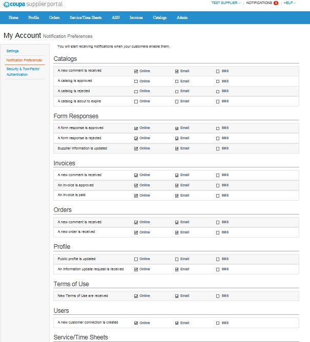 This section helps you manage the notification preferences on Purchase Orders, Invoices, Catalogues, User connection, profile updates. Please select and tick the appropriate box to confirm your preferences.