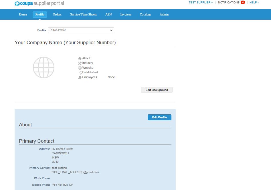 This section helps you manage your profile on the Coupa Supplier Portal i.e. address, and key contact details [Optional]