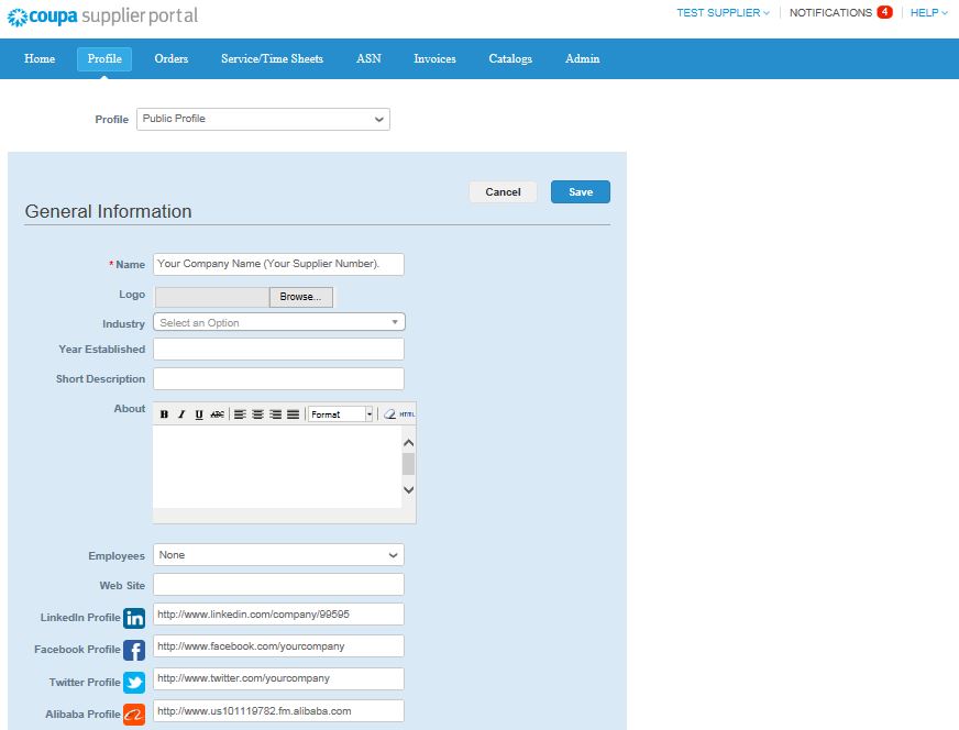 a. Home: This section helps you manage your public profile for transacting with other customers on Coupa.