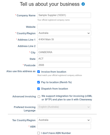 If you opt to join the CSP, you will be taken to a Coupa landing page, where you will confirm your address, invoicing options, and ABN.