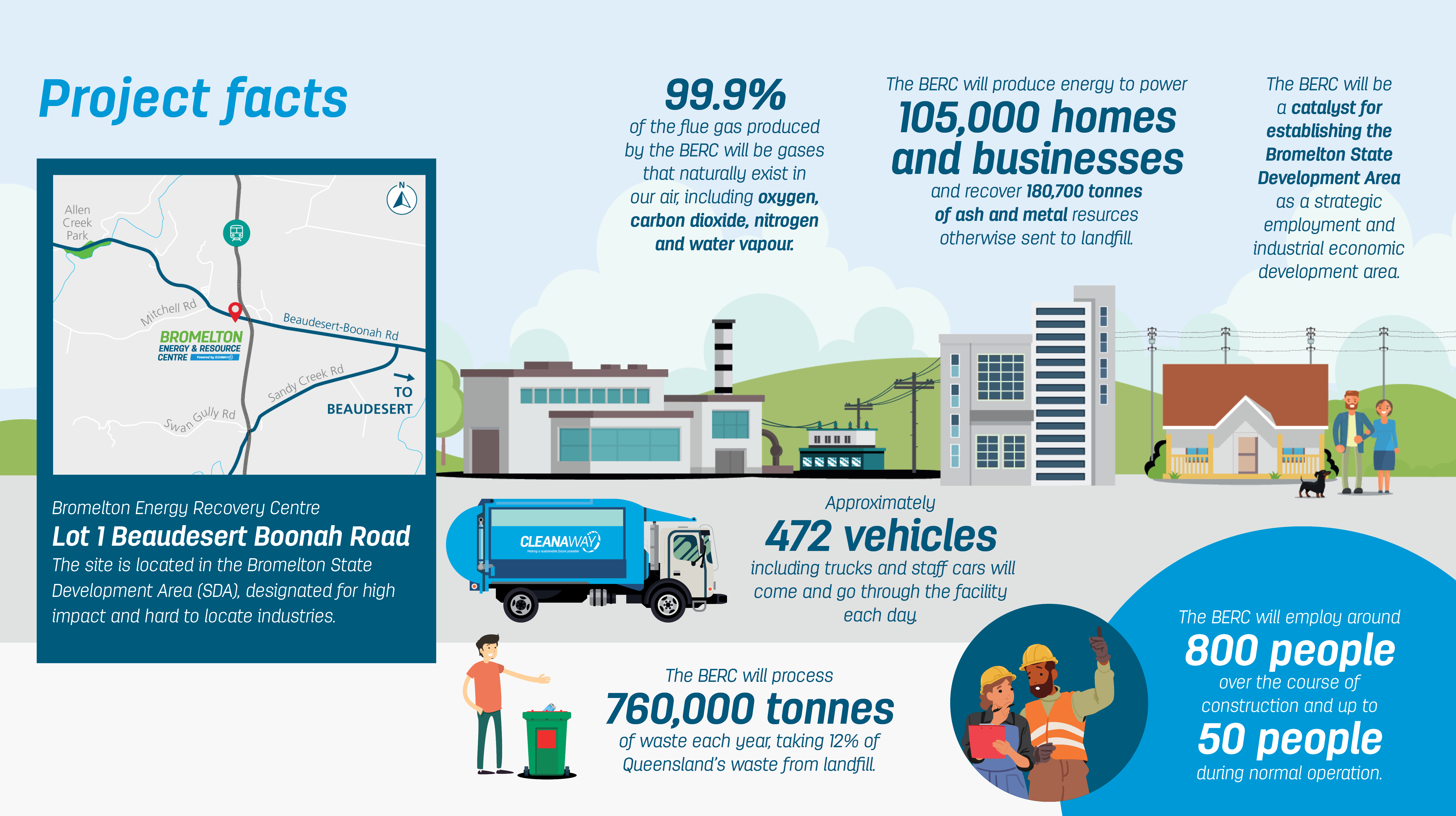 The proposed site is a 62 hectare parcel of land within the Bromelton State Development Area (SDA). This location is part of a Special Industry Precinct for difficult to locate industry. Cleanaway will be seeking the Queensland Government’s approval for this project in 2026.